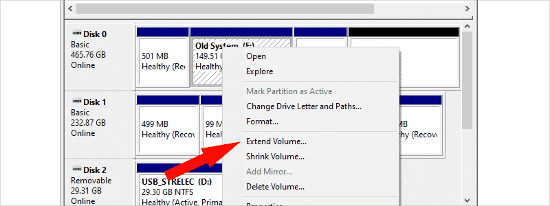 - When you have finished that, go to the partition that you want to extend, right-click on it and select “Extend Volume”.