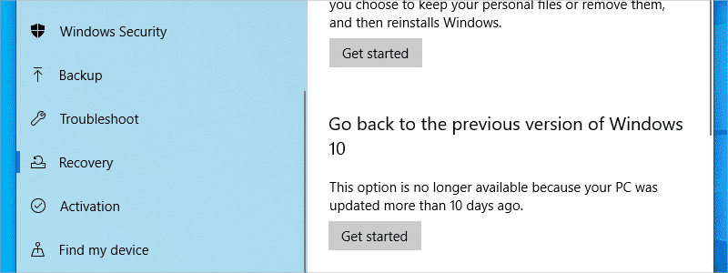 - Have in mind that this function is available only up to 10 days after the upgrade; therefore, if “Get started”, bellow “Go back to the previous version of Windows 10” option is grayed out (as shown in the picture) that is because the 10 days period has passed.