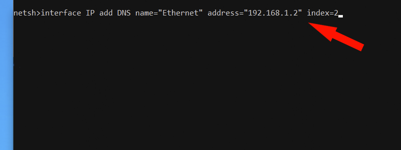 - If you also want to enter the alternative DNS address, you should type “interface IP add DNS name=”Ethernet” address=”192.168.1.2″ index=2” and press Enter one more time, and that is it. Also, don’t forget to change the Ethernet and 192.168.1.2, into the appropriate one, as explained earlier.