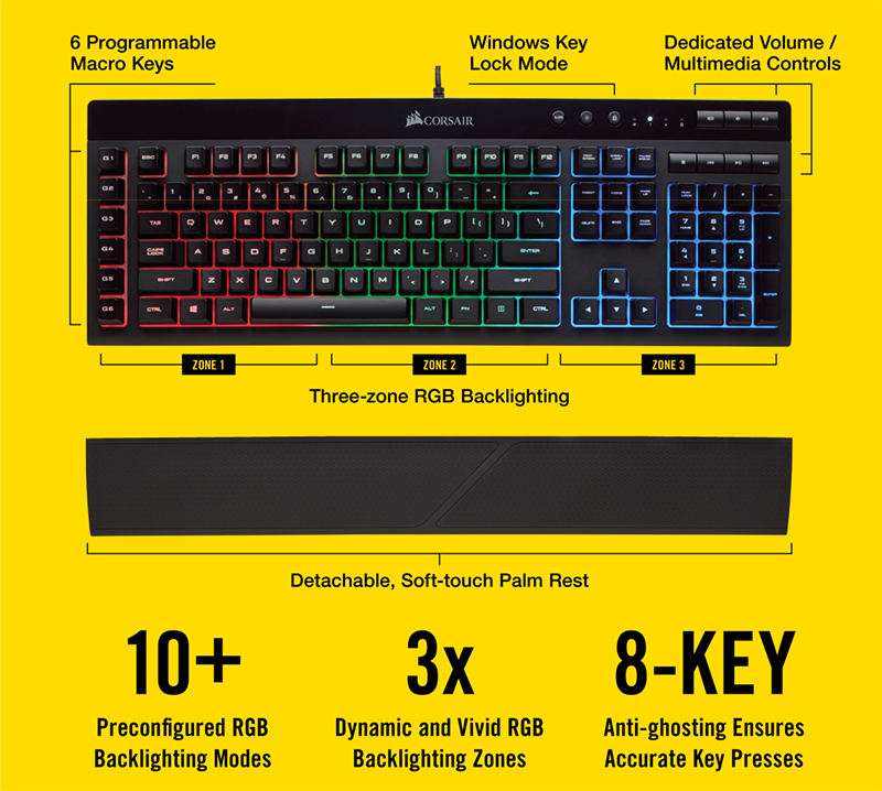 The Corsair K55 is a best seller for the company, and for good reason: price baby. Everything nowadays revolves around “bang for the buck”, and in this regard, the K55 plays in a league of its own.
