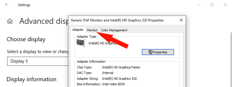 If you also want to change it, you need to click on “Display Adapter Properties” link.