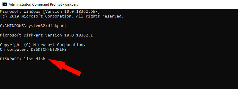 - After this, type “list disk” and press “Enter”.
