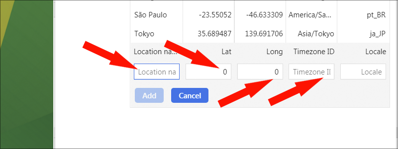 - Type the “Location name”, “Latitude”, “Longitude”, “Timezone ID”