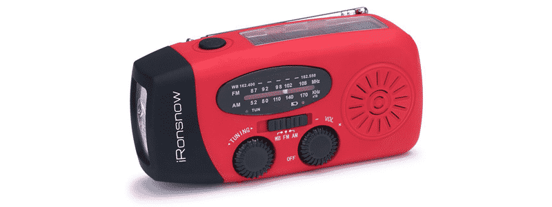 The iRonsnow weather radio fits nicely in one hand but has all the right features to keep you out of trouble. The flashlight is bright (it has 3 LEDs), it has a 1000mAh backup battery and it receives AM/FM and NOAA channels.