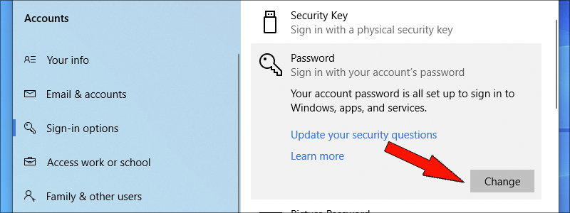 - Choose the “Password” option, under the “Manage how you sign in to your device” and press “Change”.