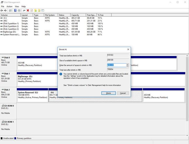 After clicking the Shrink button, your system may take a while before creating the free space.