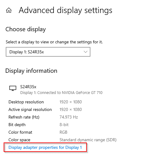 - Step 4: Locate the required display in the Display details section and choose Display adapter properties for Display X on the following page.