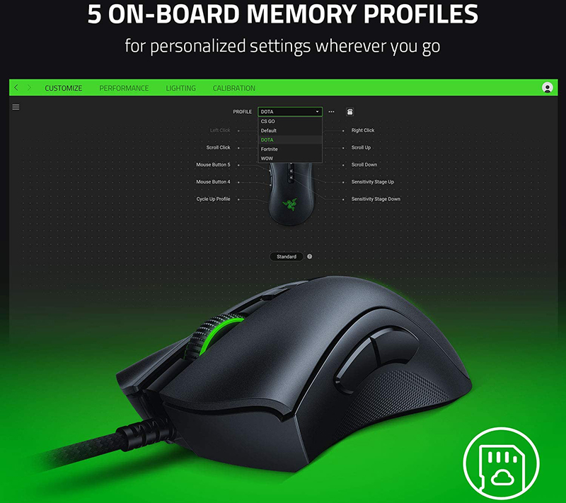 Now, if you’re 13 years old, you’ll definitely approve of Razer’s new button on the base that switches between custom profiles for sensitivity and RGB lighting. Everything works through Synapse software, which means you can set up an unlimited number of profiles, and/or store 5 in the on-board memory to use regardless of where you plug in the V2. So yeah, this gaming mouse is travel-friendly.